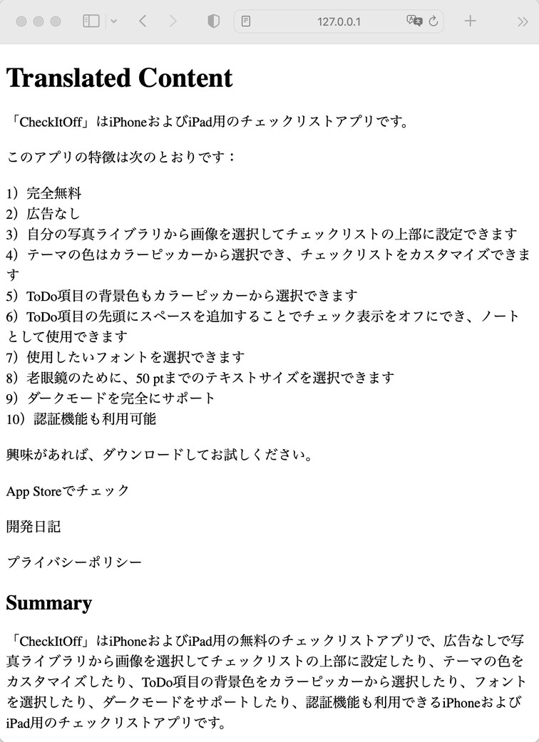 この Web アプリを使うと、例えばこの私の英語のページをリアルタイムで ChatGPT に日本語に訳してもらい、尚且つ要約してもらうことも可能です。